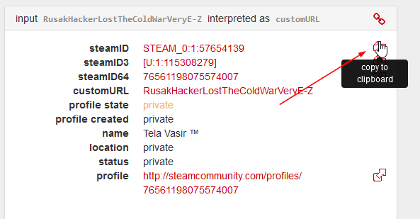 Clicking the icon beside the steamID will copy the steamID to the clipboard.
